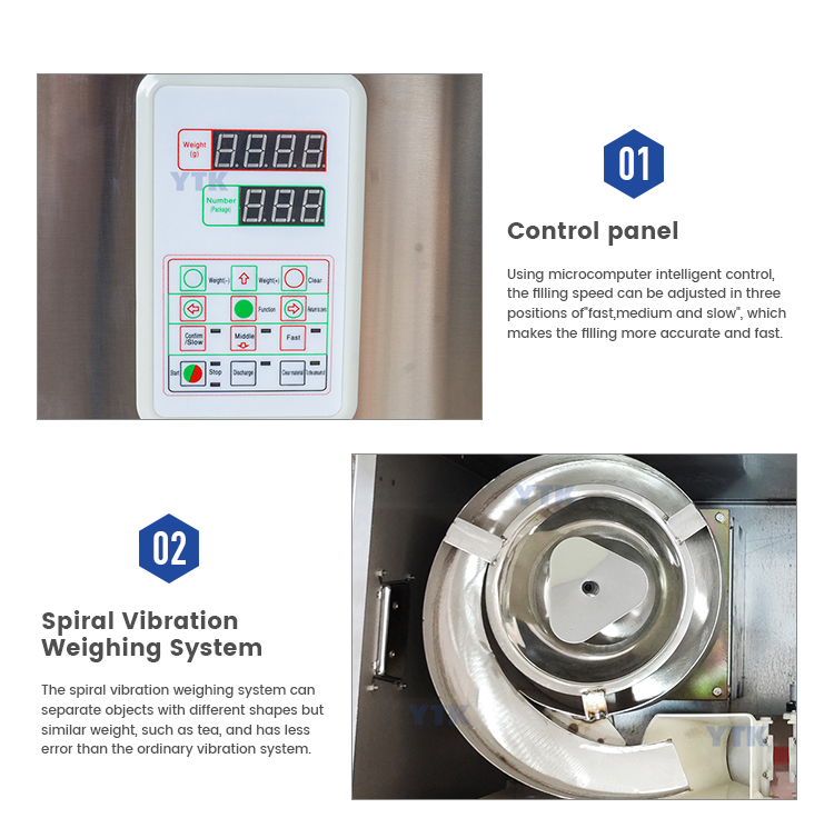 This machine is specially used for weighing and filling tea or herb. Its special spiral feeding design can work with tea or herb easily.It has fast dispensing speed and small error. The use of microcomputer control of optical technology, high accuracy, fast speed, good quality, can solve the traditional tea packaging tedious process. It is a powerful helper for all kinds of tea.