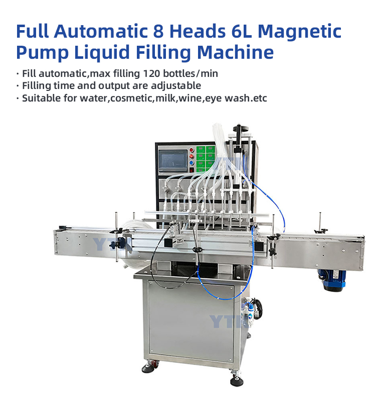 This 8-head automatic magnetic pump filling machine body is made of all stainless steel. It comes with automatic counting function. The performance is reliable and the measurement is accurate. It is an excellent machine for filling particle-free liquid.The filling nozzles can be customized according to your requirements(like 4 or 6), and customers can control each nozzle separately.